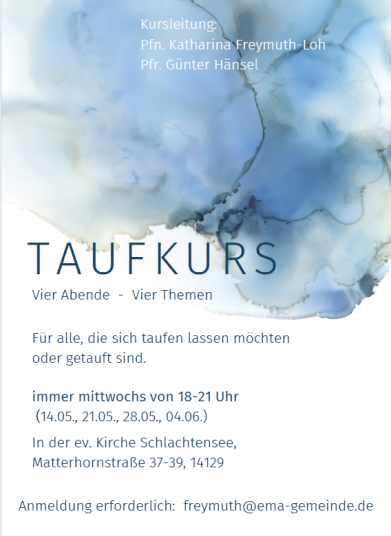 Wir laden Sie herzlich zu unserem Taufkurs in Schlachtensee ein! Entdecken Sie gemeinsam mit uns die Bedeutung der Taufe und tauchen Sie in eine Gemeinschaft ein, die von Glauben und Freude geprägt ist.